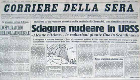 • Il primo allarme, in Europa, arriva da Stoccolma e Helsinki, e poi da Oslo e Copenaghen, dove si registra un inquietante aumento del livello di radioattività. In Italia l’Ansa dà questa notizia alle 17.58. Dopo che per tutta la giornata le autorità sovietiche hanno negato l’accaduto, alle 21.01 la Tass diffonde un flash urgente: «Un incidente si è prodotto nella centrale nucleare di Chernobyl, uno dei reattori atomici è rimasto danneggiato, misure vengono prese per liquidare le conseguenze del guasto, ai colpiti viene prestato aiuto, è stata costituita una commissione governativa». Sandro Scabello, corrispondente del Corriere della Sera da Mosca, annota: La formazione di una commissione d’inchiesta governativa lascia intuire che si è trattato di una vera e propria catastrofe». Il Corriere va in stampa con il titolo “Sciagura nucleare in Urss”. [Cds 29/4/1986]